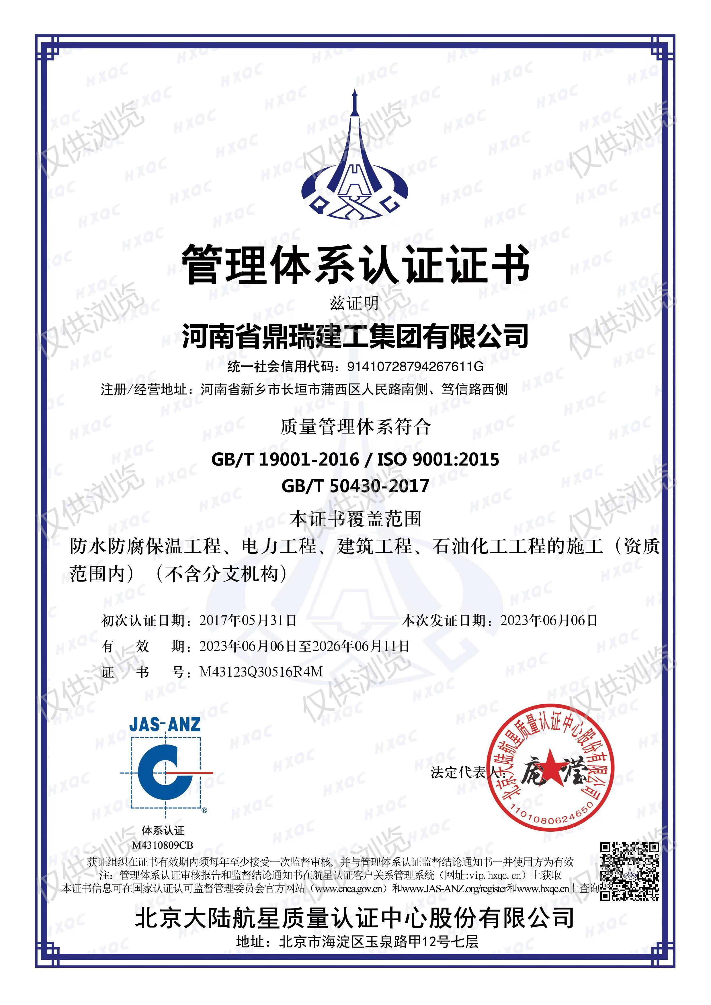 質(zhì)量管理體系認證證書